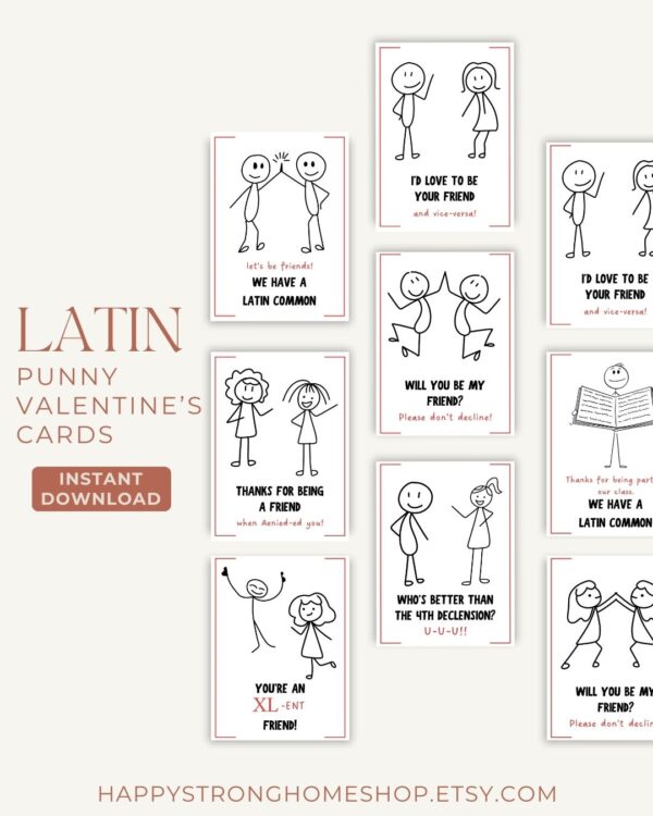 For my Classical Conversation friends, I designed this set of Latin Punny Valentines Cards! Six messages in four styles for boys, girls, friends, and teachers! Available in my shop, just click the image below: