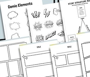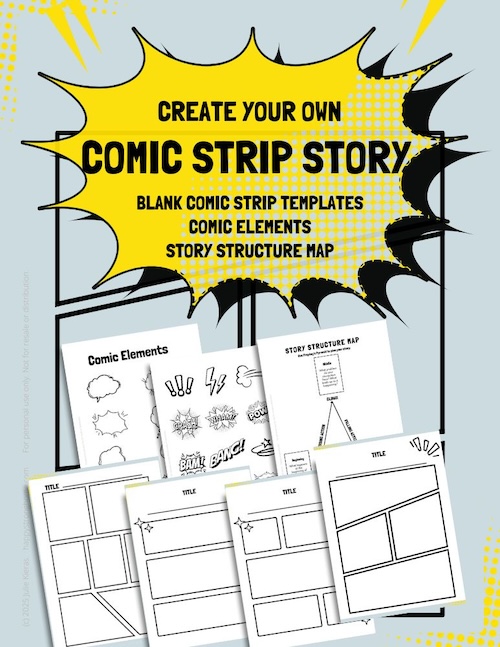 Get a free comic book panel templates printable that includes 4 Comic Strip storytelling templates, 2 pages of comic elements like speech bubbles and other visuals (different from the ones we did in our craft because I no longer have those graphics), and a story structure map to share with your kids.