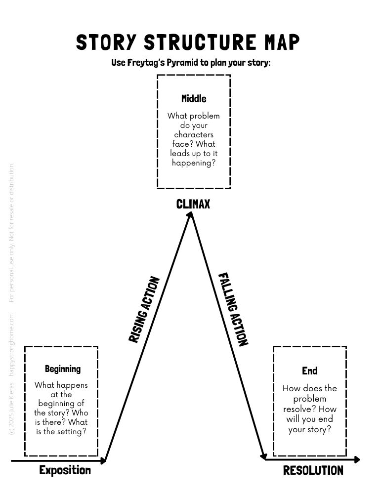 A story map, also known as Freytag’s Pyramid, can help children stay organized and finish their stories with purpose. Use this at your child’s developmental level: