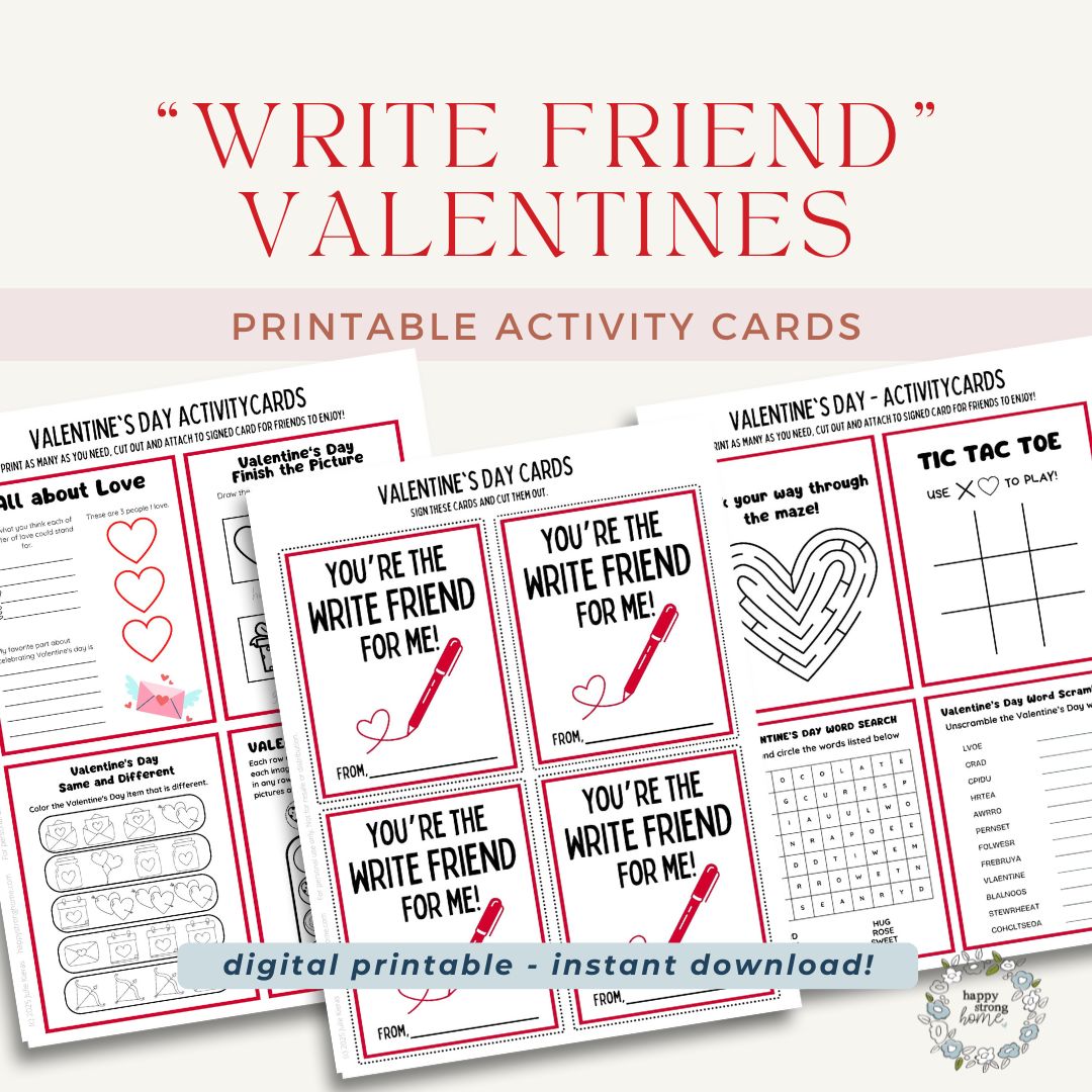 If you’re looking for a sweet Valentine’s Day card for your kids to make and give their friends, then these “Write Friend” Valentine’s Day card printables are perfect for your family or class! Bonus: They include activity cards and make a great writing project.