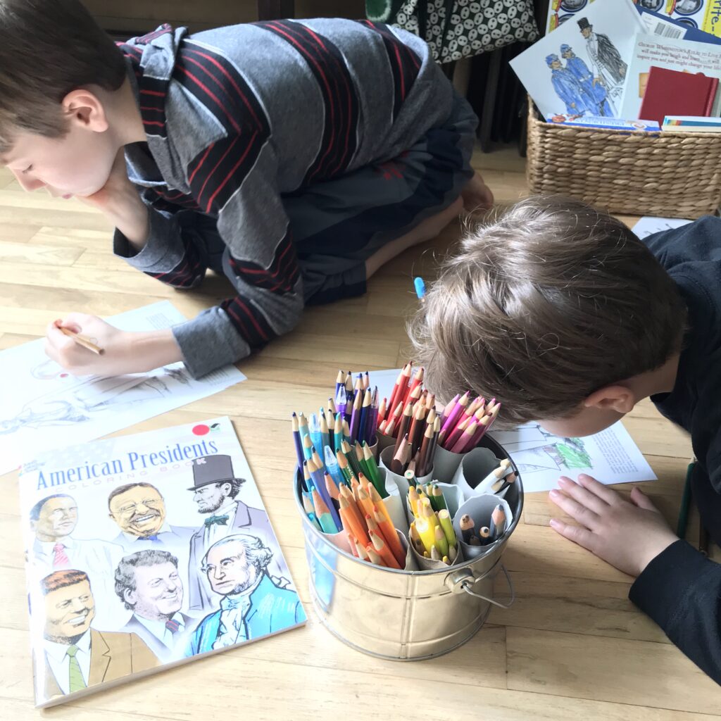 - Coloring books related to the story or seasonal themes – I included simple dinosaur drawing pads when we read about reptiles, and presidential coloring books during our U.S. History reads.